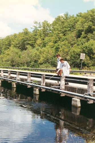 The bridge circa 1996. Patrick fishing for an